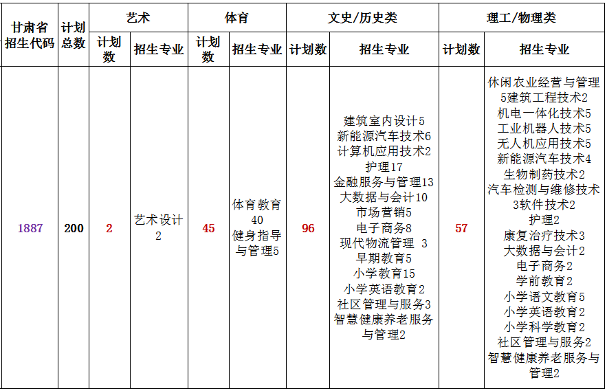 咸宁职业技术学院2021年甘肃省分类招生计划表