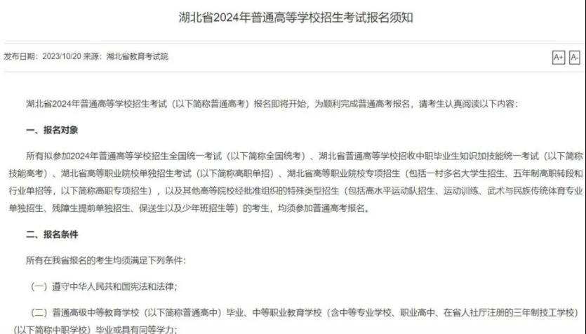 湖北省2024年普通高等学校招生考试将于11月8日开启网上报名。