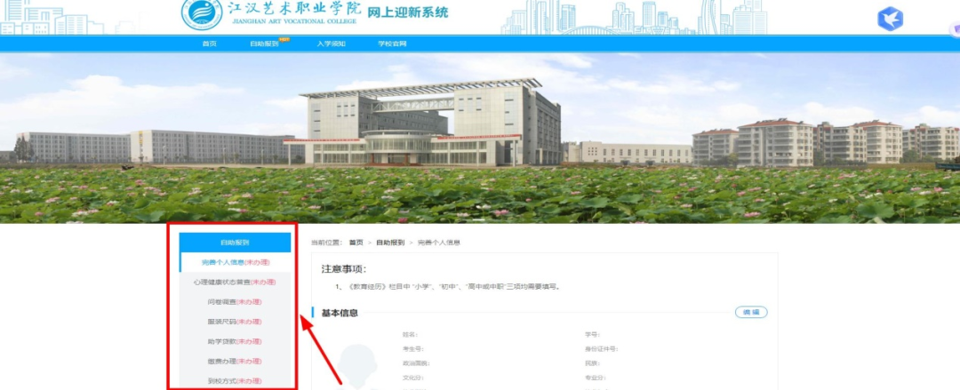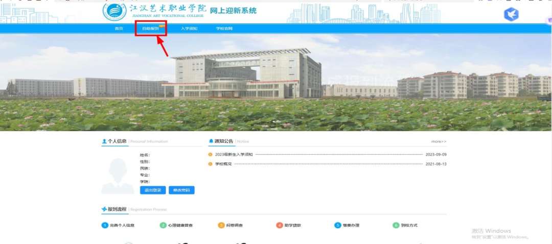 选择导航条上自助报到打开自助报到界面