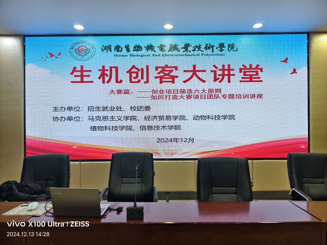 一场"关于高质量项目价值、挖掘方法及团队打造策略"的讲座,由学校招生就业处、校团委共同主办,马克思主义学院、经济贸易学院、动物科技学院、植物科技学院、信息技术学院共同承办,由王华老师主讲的"生机创客大讲堂"于2024年12月13日下午2点在东湖校区知新楼111报告厅顺利举行。