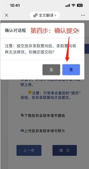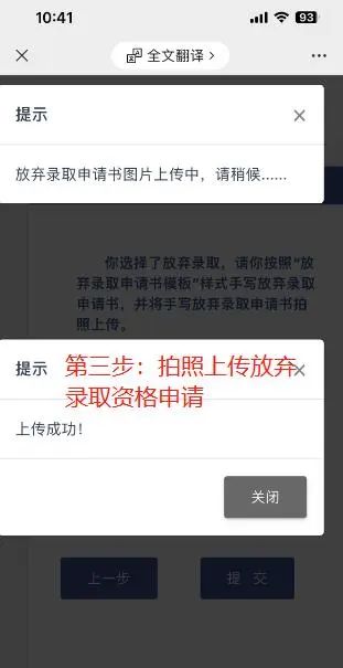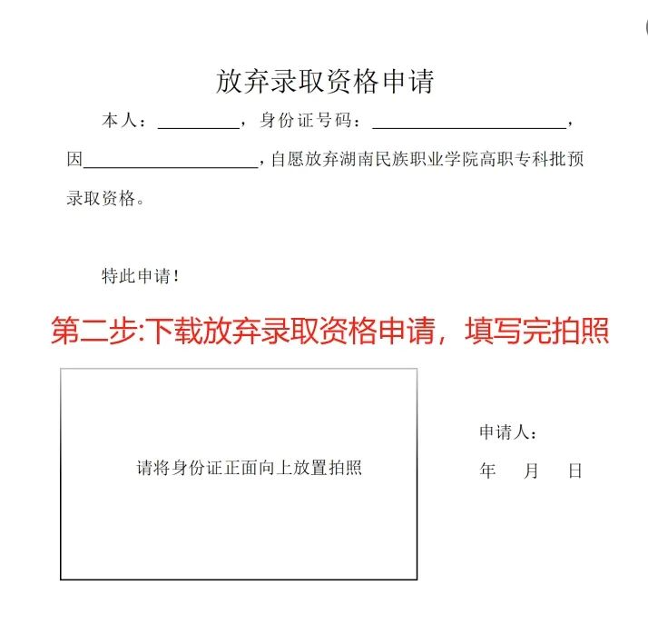 2、放弃录取,则按要求下载放弃录取资格申请书,打印并填写好,再和本人身份证(正面)一起拍照上传至确认系统。
