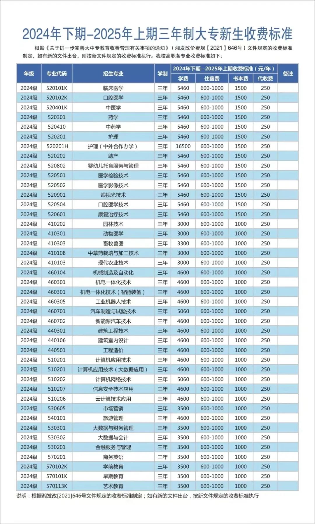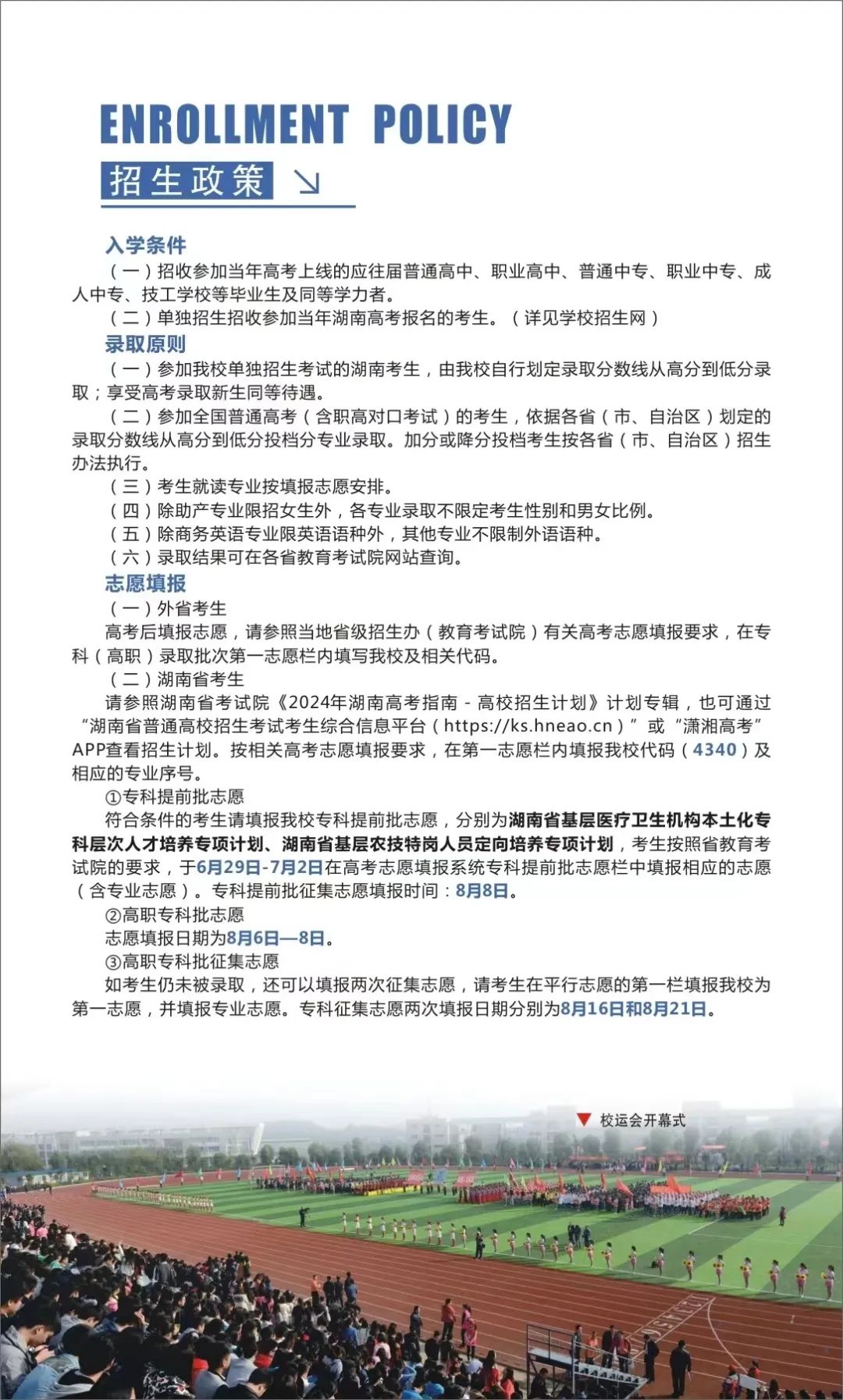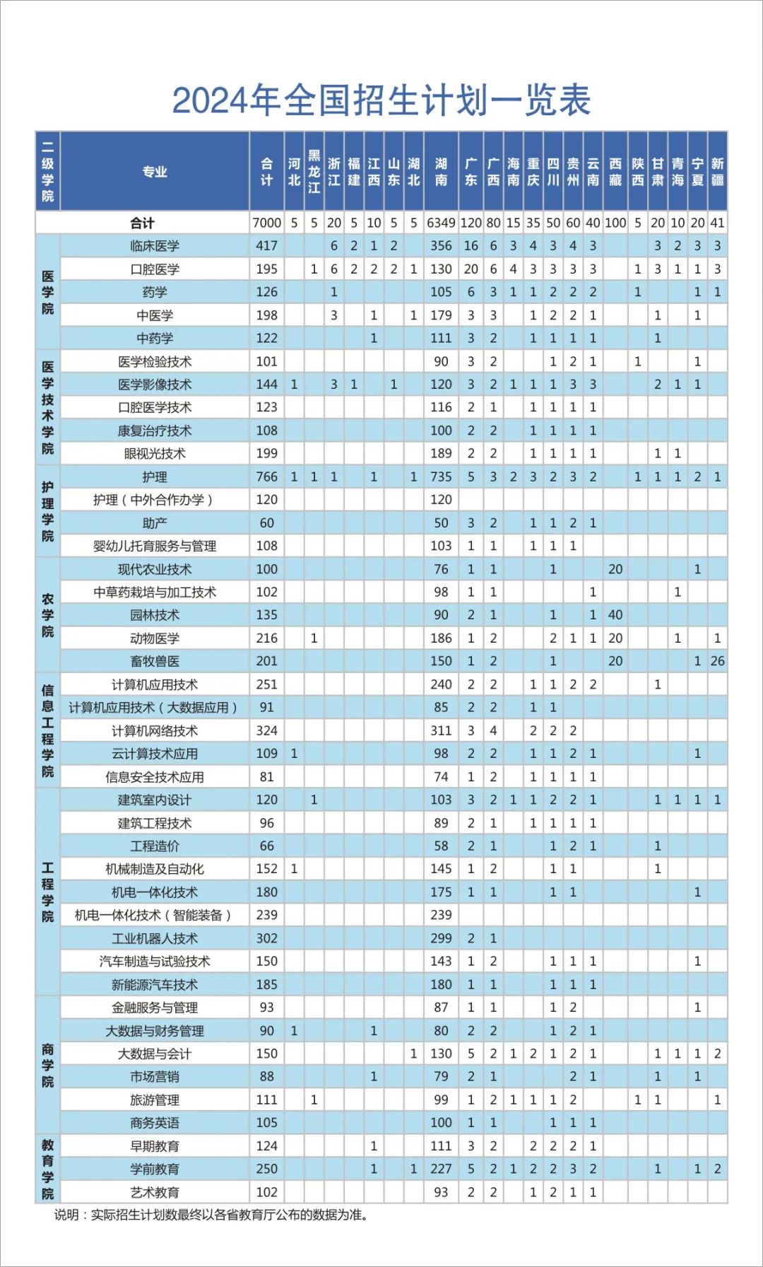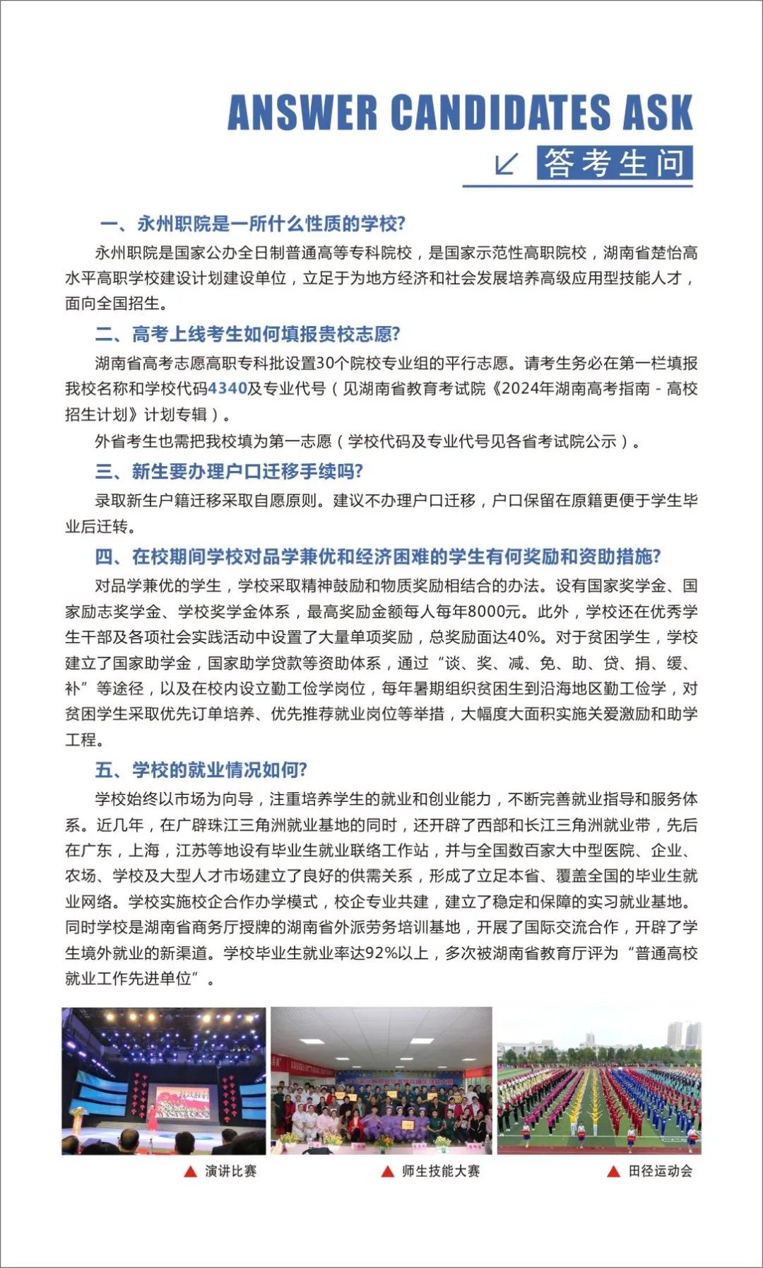 学校概况永州职业技术学院是2000年7月经湖南省人民政府批准教育部备案,由零陵卫校和零陵农校合并升格而成。为整合永州教育资源,2003年6月经湖南省人民政府批准,将原零陵商校、零陵师范、零陵工校三所普通中专成建制并入。学校总占地面积3300亩,总建筑面积64.43万平方米,固定资产总值 11.80亿元,其中,教学仪器设备总值2.47亿元,馆藏图书 104.05万册。教职员工1205人,其中正高职称67人,副高职称301人。设13个二级学院和教学部,开设39个高职专业,面向27个省市区招生,全日制在校学生2.1万余人。现有国家级教学团队1个,省级教学团队5个;国家级骨干专业3个,省级(示范性)特色专业4个,省级高水平专业群3个;国家级生产性实训基地1个,国家级协同创新中心1个,省级生产实习实训基地2个,省级教师培训认证基地2个;国家级专业教学资源库1个,省级专业教学资源库2个;教育部第二批现代学徒制试点高职院校和首批“1+X”证书制度试点院校。拥有附属医院、生态养殖实训中心、畅通驾校等三大校内生产性实习实训基地。学校自组建以来,坚持“立足永州,服务三农”的办学定位,致力于为地方经济和社会发展培养高素质技术技能人才,走出了一条“以服务求支持,以贡献求发展”的办学新路子,形成了鲜明的办学特色,取得了显著的办学业绩。学校先后荣获全国职业教育先进单位、全国高职高专人才培养水平评估优秀学院、国家教学成果一等奖、全国模范职工之家、湖南省文明高校、湖南省职业教育先进单位、湖南省普通高校就业工作先进单位、湖南省普通高校就业创业工作“一把手工程”优秀单位、湖南省普通高等学校党建工作先进高校、湖南省普通高校大学生思想政治工作优秀单位、湖南省普通高校大学生心理健康教育先进单位、湖南省首届黄炎培职业教育优秀学院、湖南省普通高校党风廉政建设先进单位、全国普通高校学籍学历管理工作先进集体、湖南省绿化工作先进集体、湖南省高校后勤工作先进集体、湖南省关心下一代工作先进集体等多项重大荣誉。2010年10月,学校顺利通过示范院校国家级验收,被确定为国家示范性高等职业院校。2022年7月,学校成功入选湖南省楚怡高水平高职学校建设计划建设单位,学校护理专业群、现代农业技术专业群、医学影像技术专业群等入选为湖南省楚怡高水平专业群建设计划。学校设有“国家职业技能鉴定所”和“特有工种职业技能鉴定站”,学生经考核毕业后可获得学历证书及相关专业职业资格证书。学校设立了国家奖学金、国家励志奖学金和学校奖学金,并制订和建立了一整套关爱贫困学生的制度和资助体系,如国家助学金、国家生源地贷款和学校助学金等。此外,学校为贫困学生设立了勤工俭学岗位,采取订单培养、优先推荐就业岗位举措,为贫困学生顺利完成学业和就业开辟绿色通道。学校在全国范围内建立了毕业生就业信息联络站和就业基地,与数百家大中型医院、企业、学校建立了实习和就业联系,对合格毕业生长期推荐工作。2024年面向湖南、河北、黑龙江、浙江、福建、江西、山东、湖北、广东、广西、海南、重庆、四川、贵州、云南、西藏、陕西、甘肃、青海、宁夏、新疆等省份计划招收国家任务全日制高职(专科)学生,招生人数7000人,学制三年,实行文(历史类)理(物理类)兼招,高考改革省份其他选考科目不限。经湖南省教育厅批准,我校今年继续面向湖南省部分县市区普通高中毕业生招收乡镇农医定向培养专科生,在专科提前批录取。共有计划84名,其中湖南省卫健委计划44名,专业临床医学、中医学;湖南省农业农村厅计划40名,专业动物医学。学制3年,全日制学习。免学费,带编就业。同时,今年我校与湖南科技学院携手实施“楚怡工匠计划”,培育本科层次制药工程专业学生,招生计划100名,学制4年,安排本科批次录取。学生在我校完成四年本科阶段学习合格后,可获得湖南科技学院的普通本科毕业证书和学位证书。自由布局