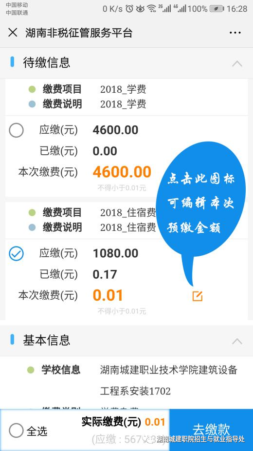 5、进入缴费详情页面,查看待缴信息栏,选择单个或多个缴费项目,核对基本信息栏内容无误后,点击“去缴款”;点击本次缴费右侧编辑图标可编辑本次缴费金额;