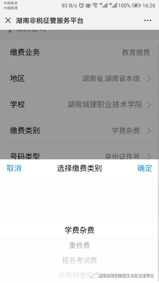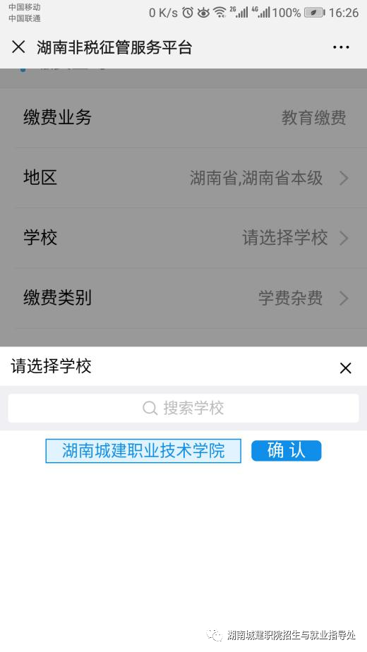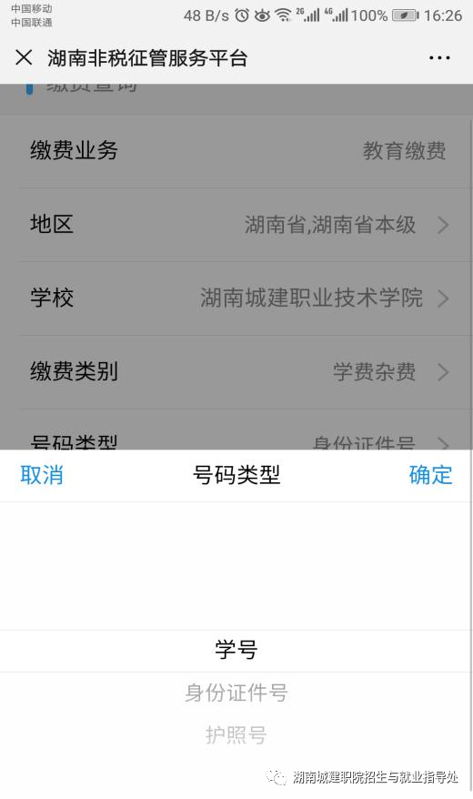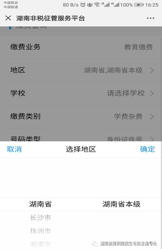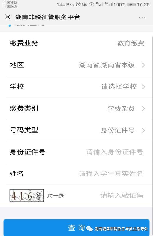 4、查询缴费页步骤:选择地区(湖南省—湖南省本级)——选择学校——选择缴费类别——选择号码类型——填写与号码类型对应的号码、姓名——输入验证码(在右侧输入左侧图片内容);