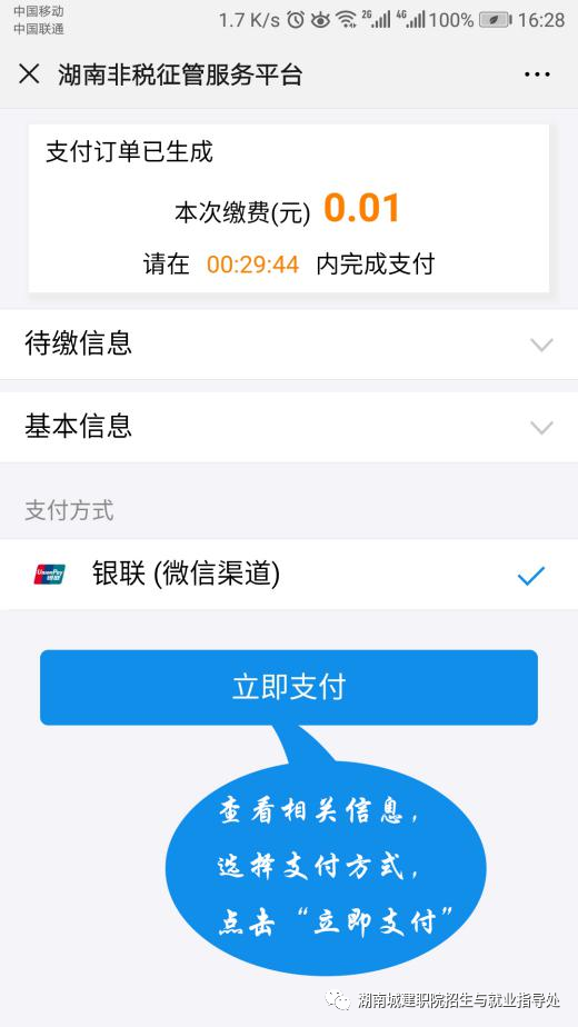 为方便家长用自己的银行卡为学生缴纳学杂费,本系统设置“微信支付”和“银联支付”为学生缴纳学杂费,各大银行银联卡都可以进行“银联支付”,不用开通网银,不收取手续费;请缴费时一定要注意检查缴费人的姓名、身份证号码等信息,一旦发现不符立刻停止网上缴费流程,并使用其他缴费方式进行缴费。