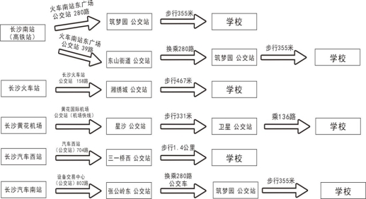 新生可在长沙市内乘坐地铁转3号线至湘龙站下车转乘158路公交车或步行至学校。
