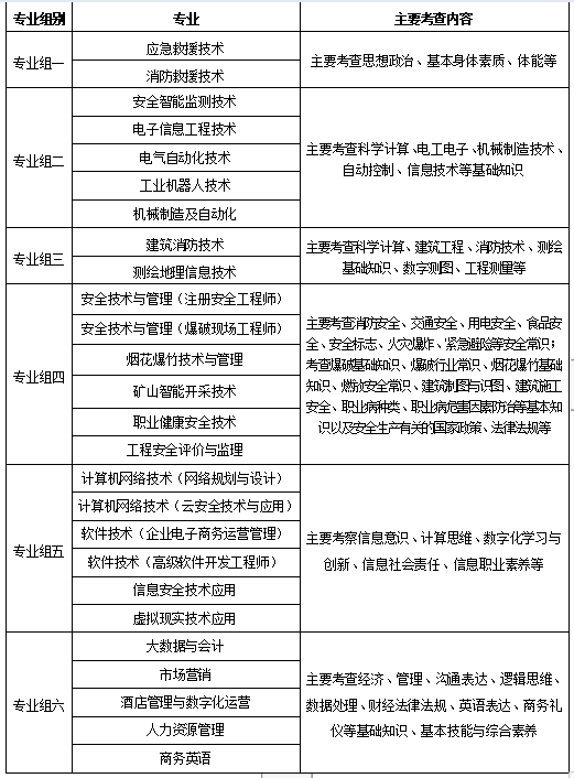 主要考察内容:专业基础知识、基本技能和综合素养等。各专业组别对应的具体考试内容详见下表。