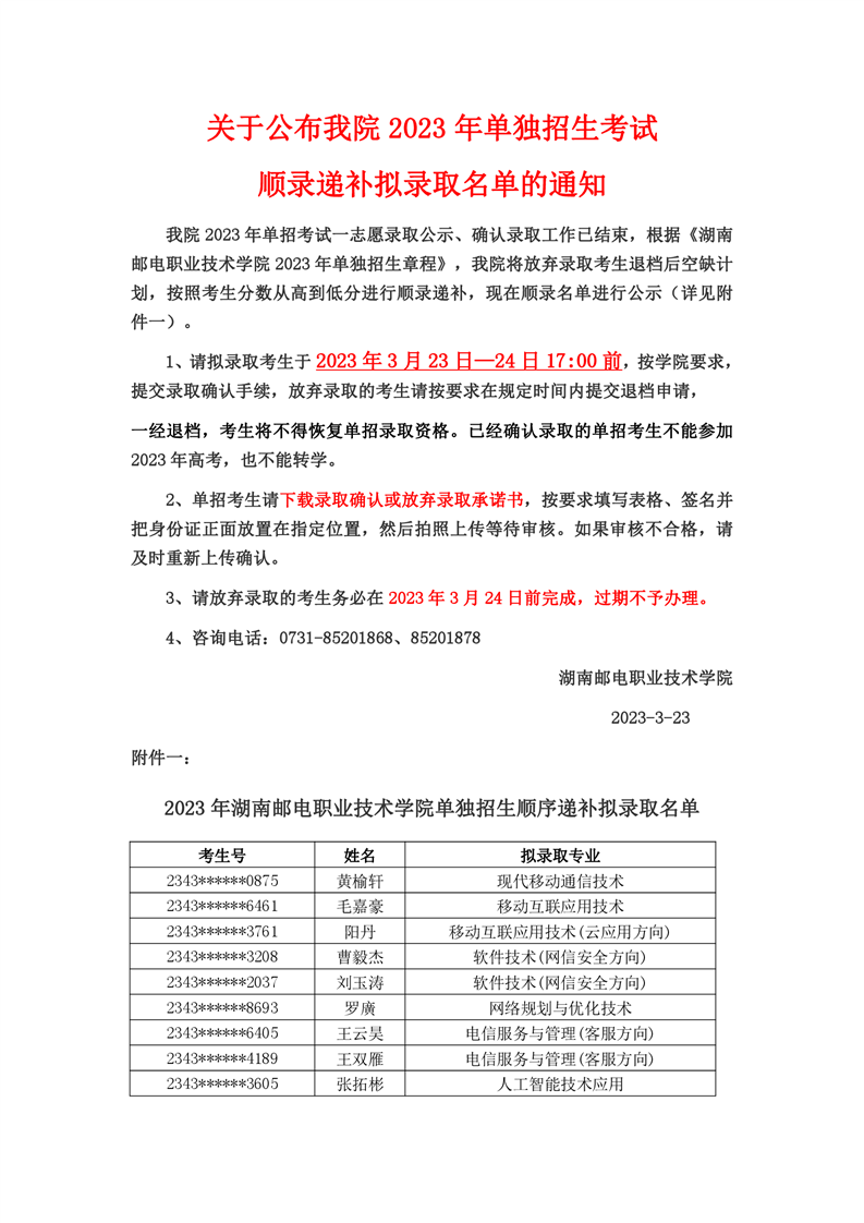 关于公布我院 2023 年单独招生考试顺录递补拟录取名单的通知