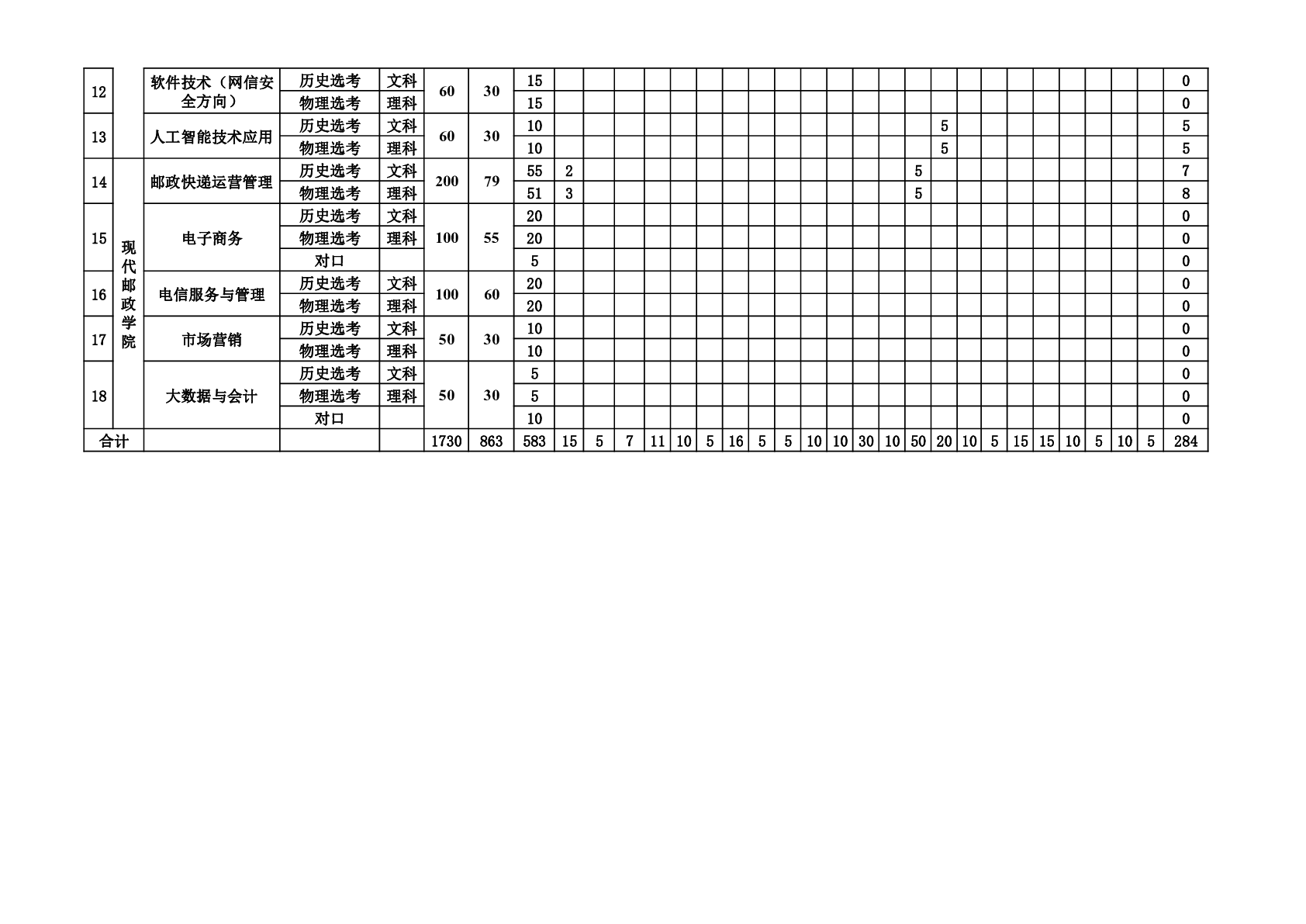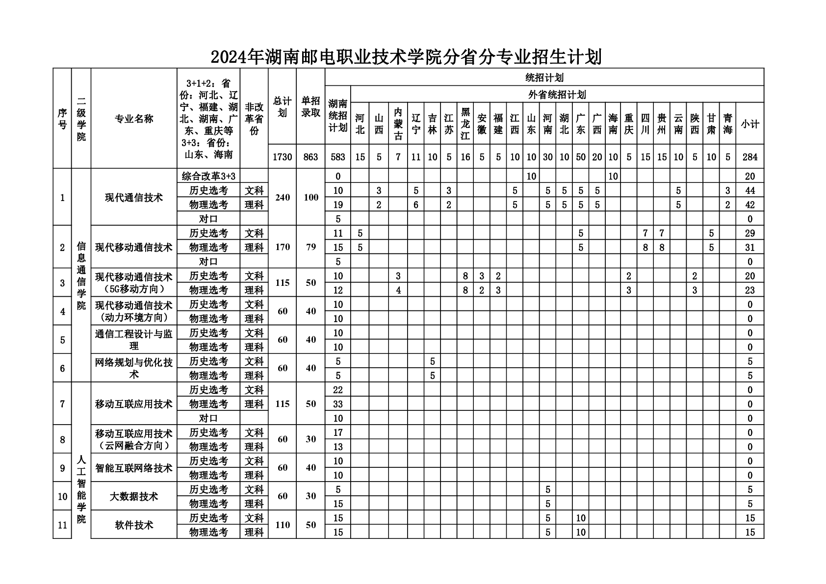 2024年湖南邮电职业技术学院分省分专业招生计划