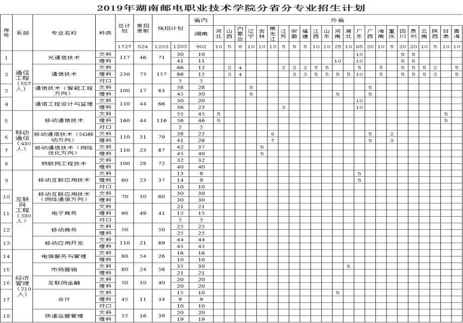 2019年湖南邮电职业技术学院分省分专业招生计划