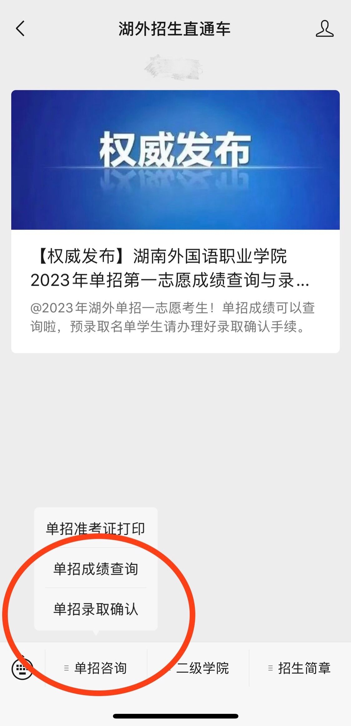 单招成绩查询请登录微信公众号“湖外招生直通车”,点击“单招资讯”进入“单招成绩查询”子菜单,按流程查询个人成绩。