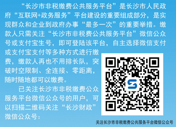 扫描上方二维码进入长沙市非税缴费公共服务平台微信公众号——点击“政务大厅”选择“非税缴费”——选择“长沙市本级”——进入缴费主页面点击“教育”——进入选择学校页面选择“长沙卫生职业学院”——选择缴费类别“学杂费”——进入缴费页面输入学生信息(学生姓名+身份证号)——进入缴费详情页面,核对缴费项目无误后点击“去缴款”——选择支付方式,点击“支付”——支付成功后点击“查看订单”查看订单详情,系统实时推送缴款通知给缴款人。