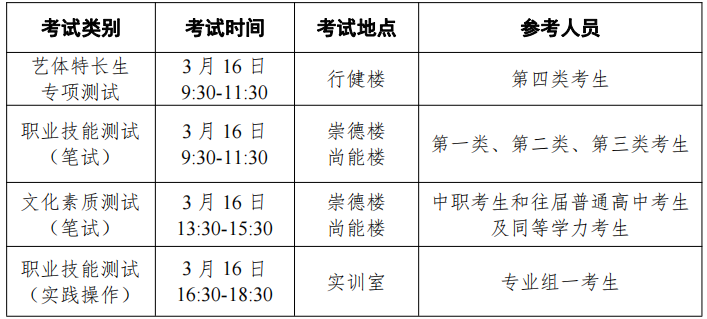 我校将按照分类考试的原则,对不同专业组的职业技能测试分别进行命题。我校文化素质测试、职业技能测试的有关说明、考试范围等,将在我校招生网上进行公布。