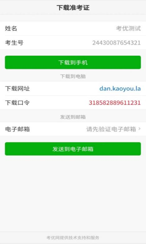 点击“打印准考证”按钮可以下载准考证,下载提供三种方式:下载到手机、下载到电脑、发送到电子信箱。
