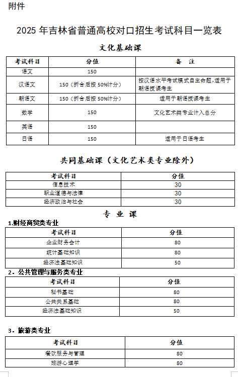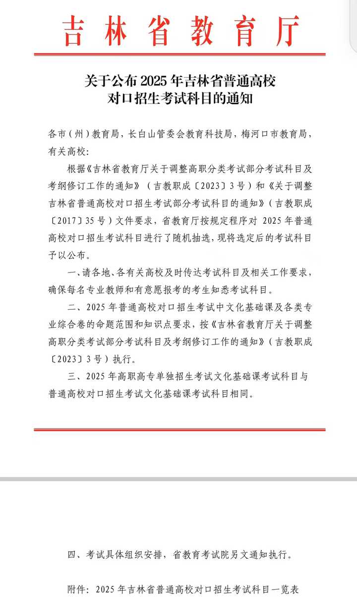 关于公布2025年吉林省普通高校对口招生考试科目的通知