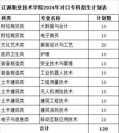 辽源职业技术学院2024年对口专科招生计划表