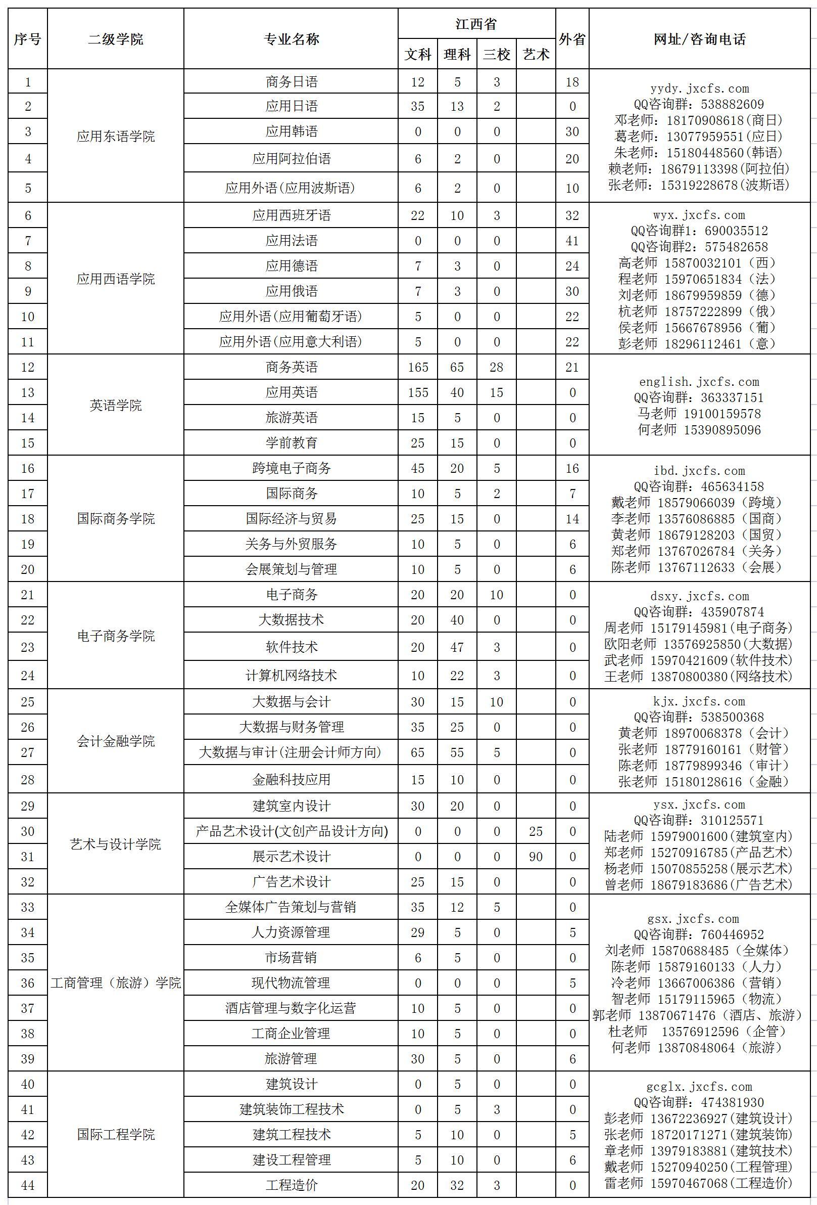 办学条件优越,专业特色鲜明。学院地处南昌东高新开发区,位于风景秀丽的艾溪湖湿地公园和瑶湖森林公园之间,校园“中西合璧,现代典雅”,被评为江西省高校“最美校园”。学院建筑面积30.9万㎡,纸质图书117.3万册,校内外实训基地300余个,建有4800㎡的校内产学园、大学生创业孵化园和创业就业示范基地等。学院开设商务英语、国际商务、会计、电子商务、学前教育等47个专业,拥有英、日、德、韩、法等11个语种,先后与30所海外高校建立了合作关系,通过专升本、专升硕及顶岗实习等多种培养模式,提升学历层次、语言应用能力和专业技能。