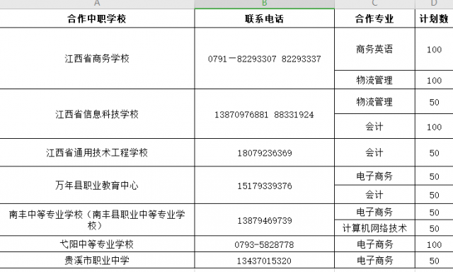 2021年我院与以下中职学校开展中高职对接“3+2”招生,即前三年在中职学校就读,成绩合格颁发由国家认可的中职毕业证书;后两年中职阶段成绩合格者可转入我院同专业大专,成绩合格颁发国家认可的江西外语外贸职业学院毕业证书。请有意向报考的学生自行与中职学校联系。