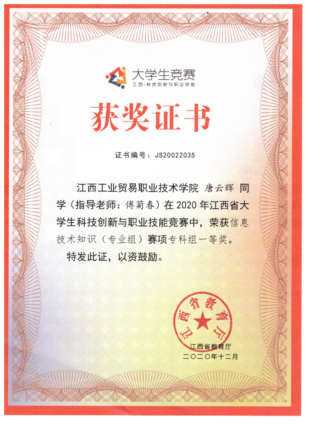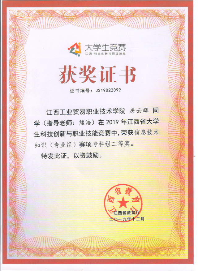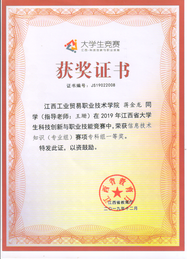 2019年获江西省大学生科技创新与职业技能竞赛“信息技术知识”赛项专科组一等奖