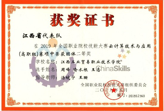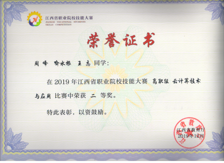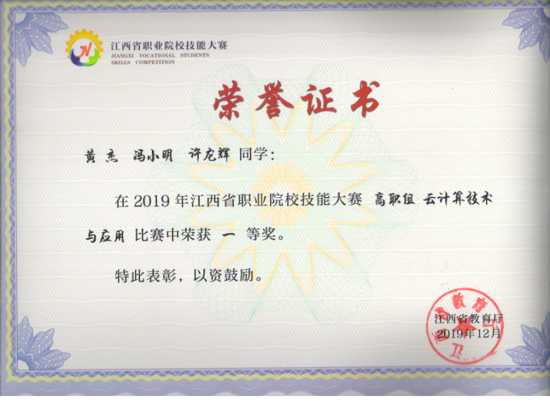 2019年获得江西省职业技能大赛云计算技术与应用一等奖、二等奖
