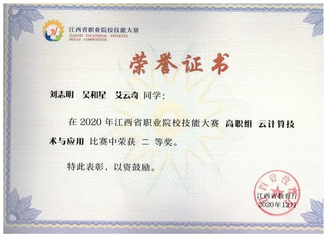 2020年获得江西省职业技能大赛云计算技术与应用二等奖两项