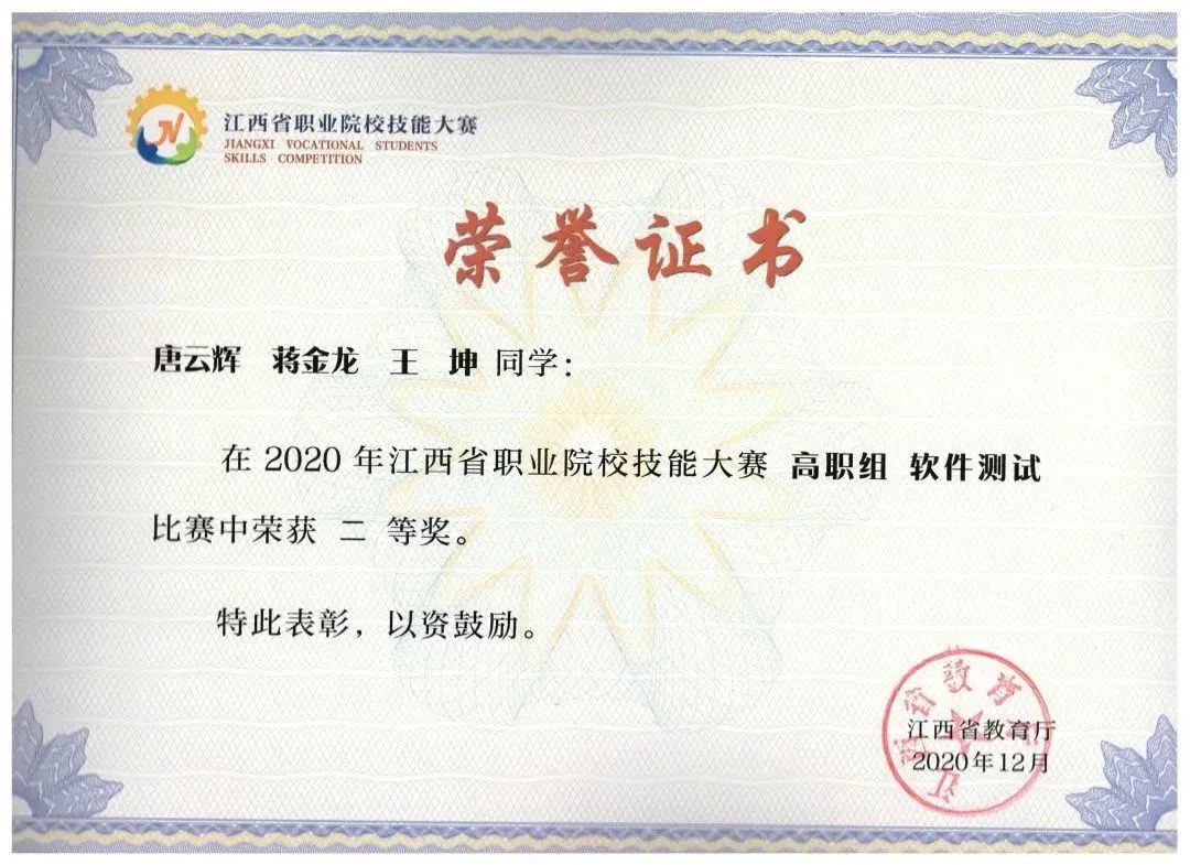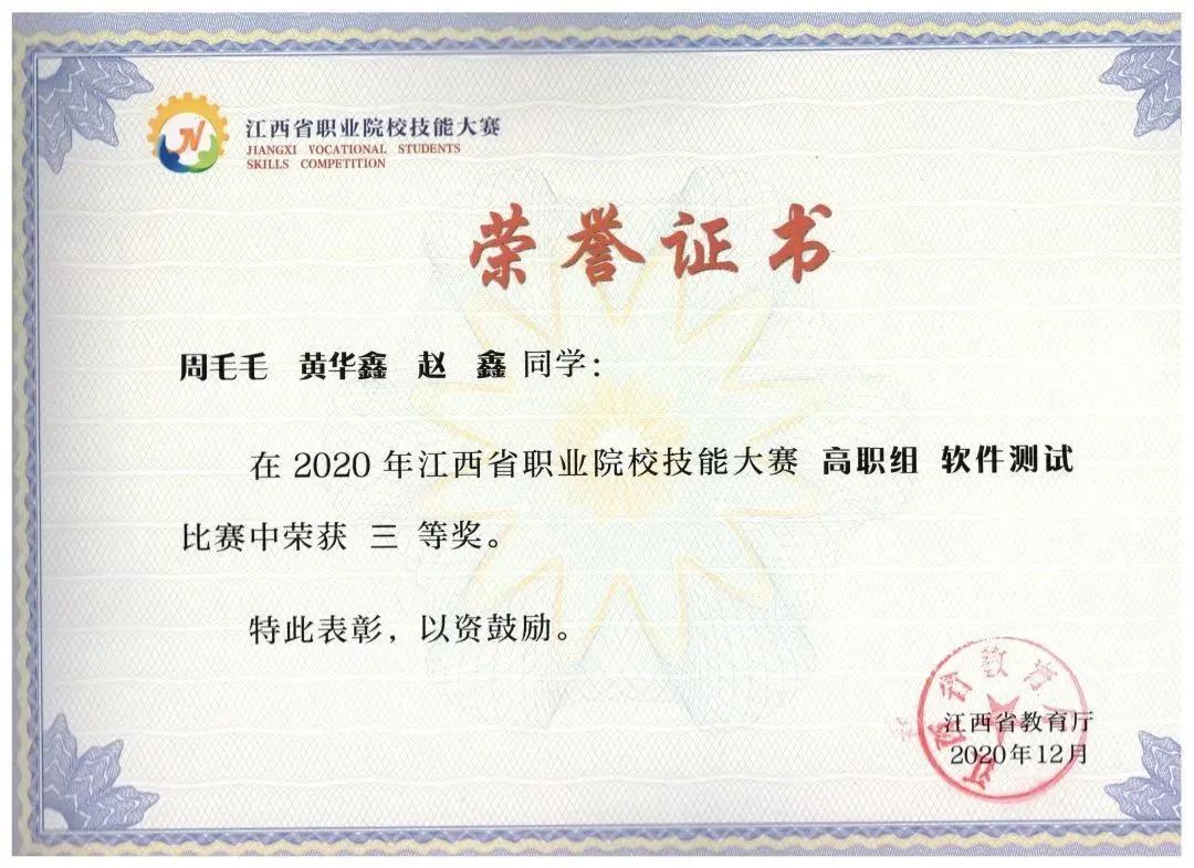 2020年获得江西省职业技能大赛软件测试二等奖、三等奖