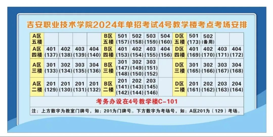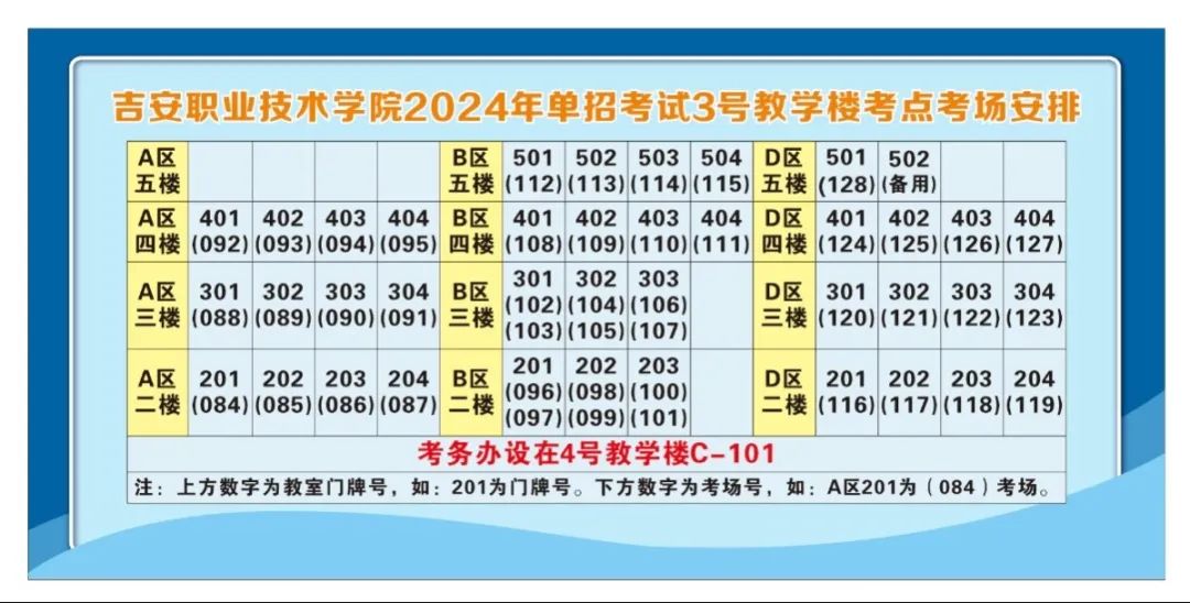3月16日高职单招考试3号教学楼84-128考场、4号教学楼129-173考场。