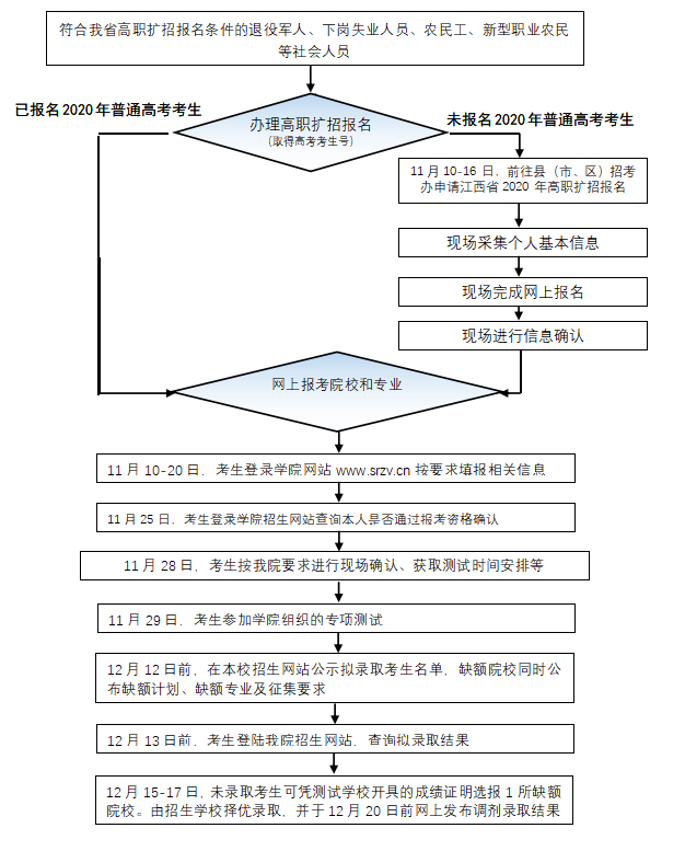 凡符合《2020年度江西省高等职业院校扩招专项工作实施方案》规定报名条件的普通高中毕业生、中职毕业生、退役军人、下岗失业人员、农民工、高素质农民、国企员工、工业园区学徒、基层医护人员、幼儿园教师等社会人员均可报名。其中退役军人身份由退役军人事务部门认定,下岗失业人员、农民工由人力资源社会保障部门认定,高素质农民由农业农村部门认定,国企员工由国资部门认定,园区学徒由园区管理部门认定,基层医护人员由卫生健康部门认定,幼儿园教师由教育行政部门认定。
