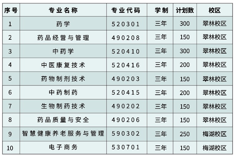 学校开设有药学、中药学、中医康复技术、中药制药、药物制剂技术、药品质量与安全、药品经营与管理、生物制药技术、智慧健康养老服务与管理、电子商务等专业,高质量打造了中医药、质量检验、医药经贸、制药工程及养老服务等特色专业群。