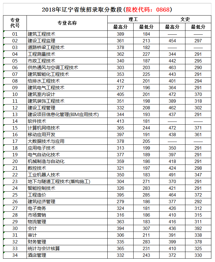 2018年辽宁省统招录取分数段