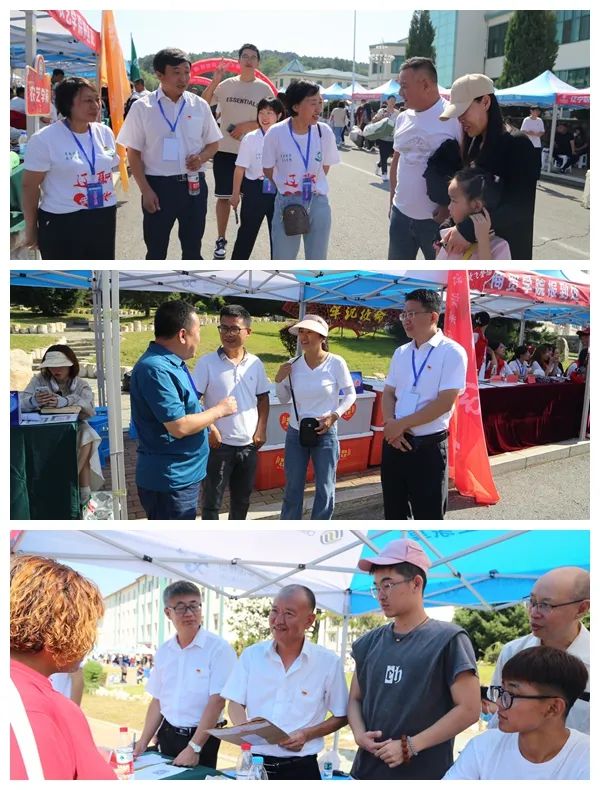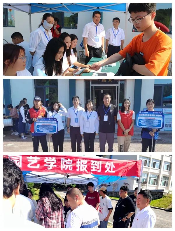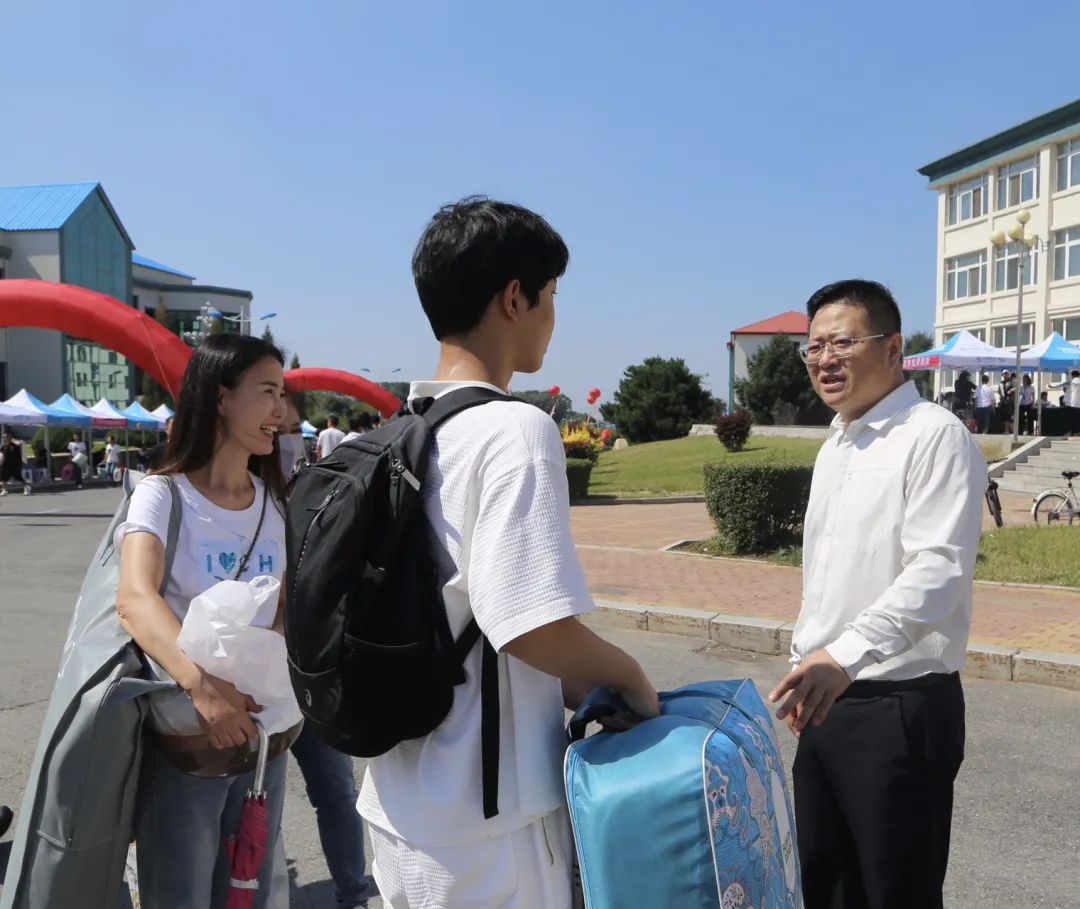 学院领导在报到点迎接新生,并走访寝室,向新生和家长介绍学校情况。