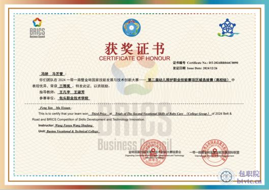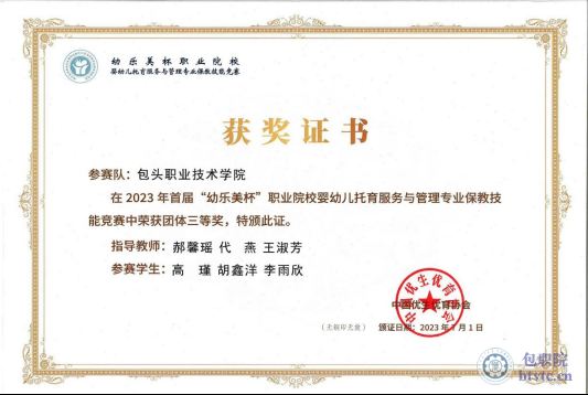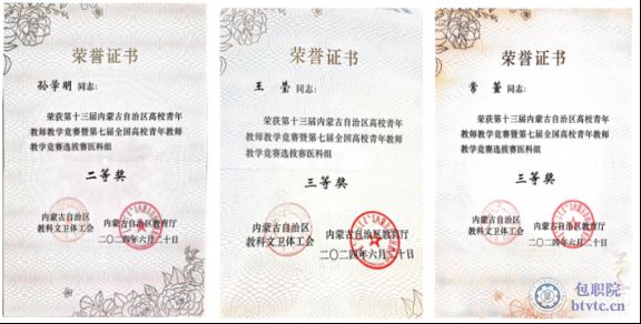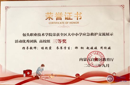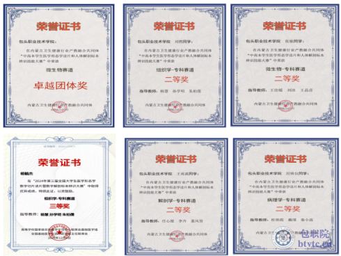全国首届大学生职业规划大赛三等奖1项,自治区高职院校技能大赛获养老服务技能赛项三等奖1项,“幼乐美杯职业院校婴幼儿托育服务与管理专业保教技能竞赛”荣获三等奖1项;自治区第十三届“挑战杯”全区大学生课外学术科技作品竞赛荣获三等奖1项;参加2024年自治区托育职业技能竞赛荣获团体三等奖1项。2024年全区职业技能大赛获奖共5项,其中健康养老照护赛项个人赛获二等奖1项、护理技能赛项团体三等奖2项、老年护理与保健赛项个人赛三等奖2项;2024年第三届全国大学生医学形态学数字切片读片暨数字解剖标本辨识大赛中获得二、三等奖8项;教师获第十三届高校青年教师教学竞赛二等奖1项、三等奖2项;获得中华护理学会组织的全国护理教师教学技能大赛三等奖1项;获得内蒙古自治区高校护理教师教学技能大赛二等奖1项;内蒙古自治区高等院校青年教师教学技能比赛荣获三等奖1项;荣获内蒙古自治区第四届红十字应急救护大赛创伤救护—单项第三名;荣获内蒙古自治区第三届红十字应急救护大赛团体三等奖1项;荣获全区高校首届应急救护大赛团体三等奖1项。