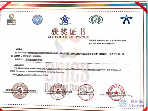 近期技能大赛获奖情况:学生参加2024一带一路暨金砖国家技能发展与技术创新大赛第二届婴幼儿照护职业技能赛项区域选拔赛(高校组)荣获三等奖1项,教师参加2024一带一路暨金砖国家技能发展与技术创新大赛第二届婴幼儿照护职业技能赛项决赛(教师组)荣获三等奖1项。