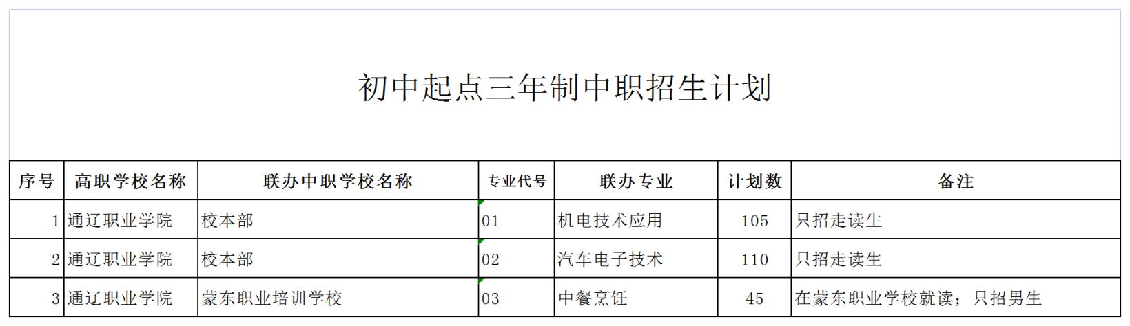 通辽职业学院2021年初中起点三年制中职计划