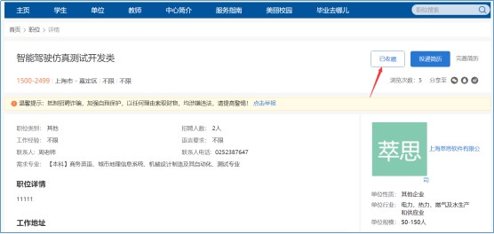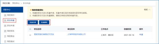 学生可对心仪职位进行收藏,收藏之后可在【学生中心】的【职位收藏】中查看以收藏职位并投递个人简历。如图: