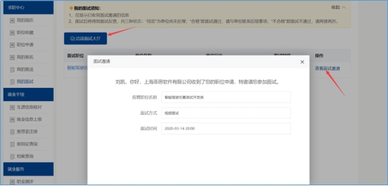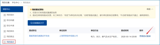 简历投递成功后,用人单位查看学生简历,可对意向学生发起面试邀请,单位发起面试后,学收到短信短信与邮件提醒,同时,在学生中心我的面试里面也可以查看,如图: