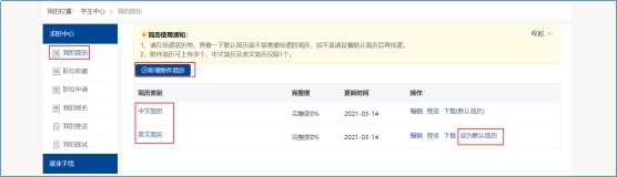 学生可在【学生中心】的【我的简历】模块中完善个人简历信息,系统简历分为:中文简历、英文简历、附件简历三种,学生可选择一种设为默认投递简历,默认投递简历完整度需达到60%才可进行在线投递。