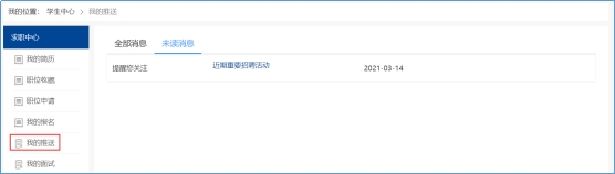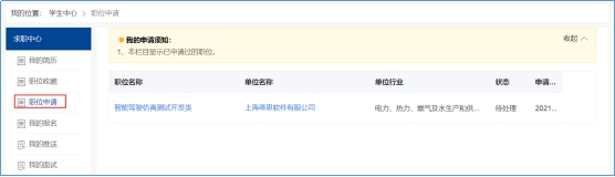 学生投递的简历,可在【学生中心】的【职位申请】模块中查看简历投递详细情况。如图:
