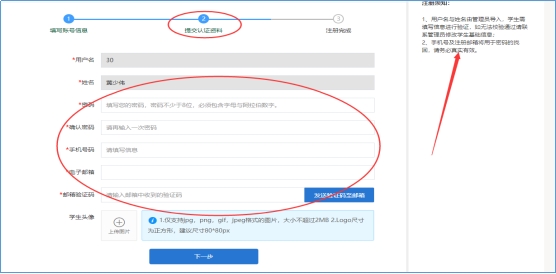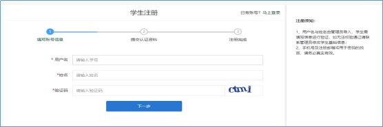 打开注册详情页面,按照注册须知提醒进行填写,输入学号、姓名、验证码,点击下一步,完成注册第一步,如下图: