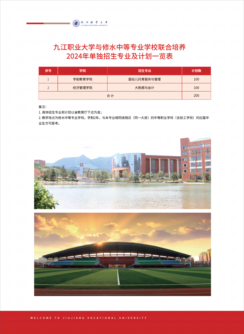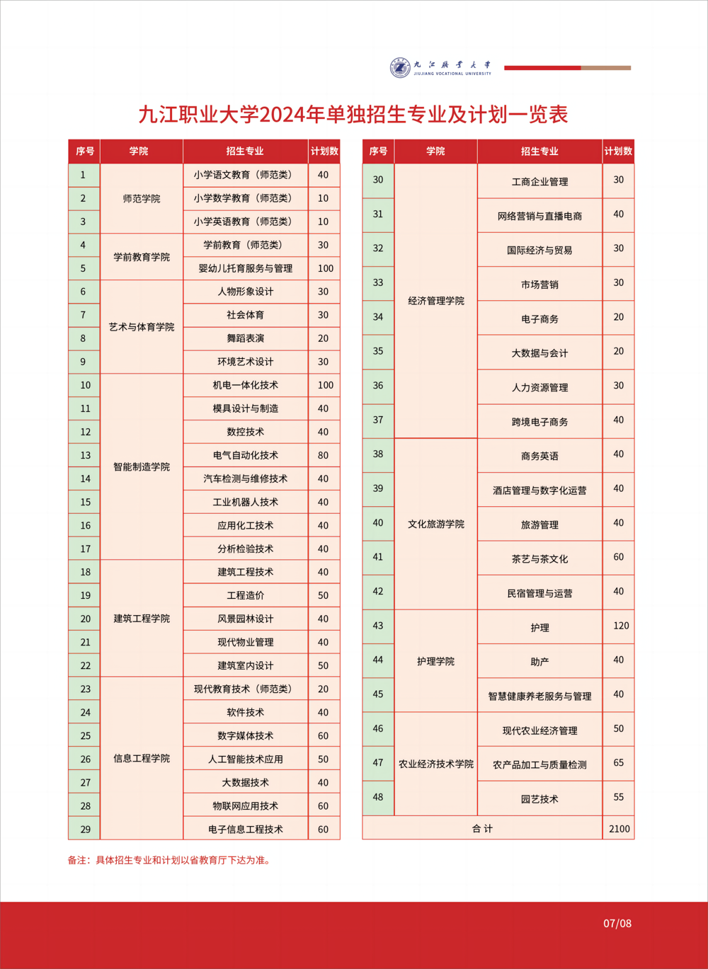 九江职业大学2024年单独招生专业及计划一览表