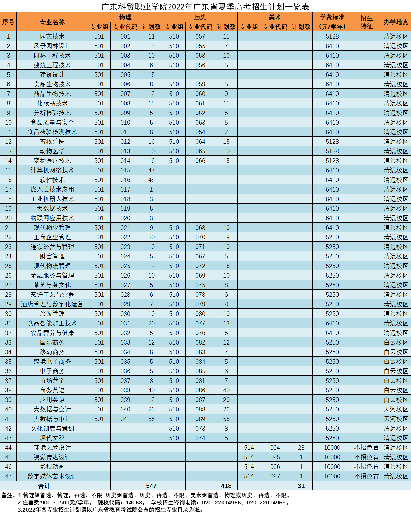 2022年我校广东省夏季高考(普通专业)招生计划一览表