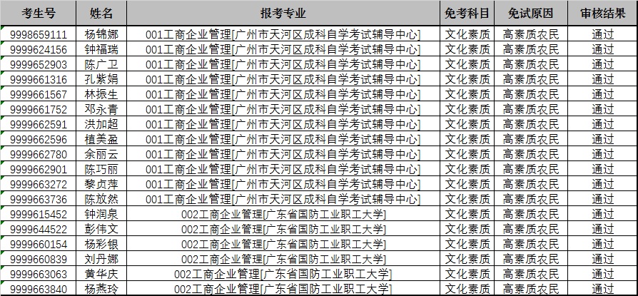 杨锦娜、钟福瑞、陈广卫、孔紫娟、林振生、邓永青、洪加超、植美盈、余丽云、陈巧丽、黎贞萍、陈放然、钟润泉、彭伟文、杨彩银、刘丹娜、黄华庆、杨燕玲,经广东科贸招生办公室审核通过,同意属于高素质农民工,免考文化素质。详见下表