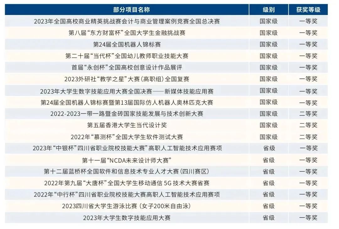 学校发挥科技职业院校特色优势,紧密对接成渝双城经济圈产业需求,助力区域经济社会发展,推动行业转型、产业升级、技术应用、社会服务,实现教学、产业、科研的协同发展。学校为应对未来社会对人才的需求,不断推动专业竞赛工作常规化、制度化,提高专业竞赛在人才培养中的引领作用,探索出一条培养提升学生创新能力的可持续发展道路。近几年,我校学生在多个专业竞赛上创造佳绩,取得多项突破。