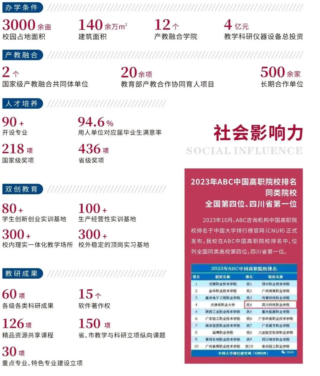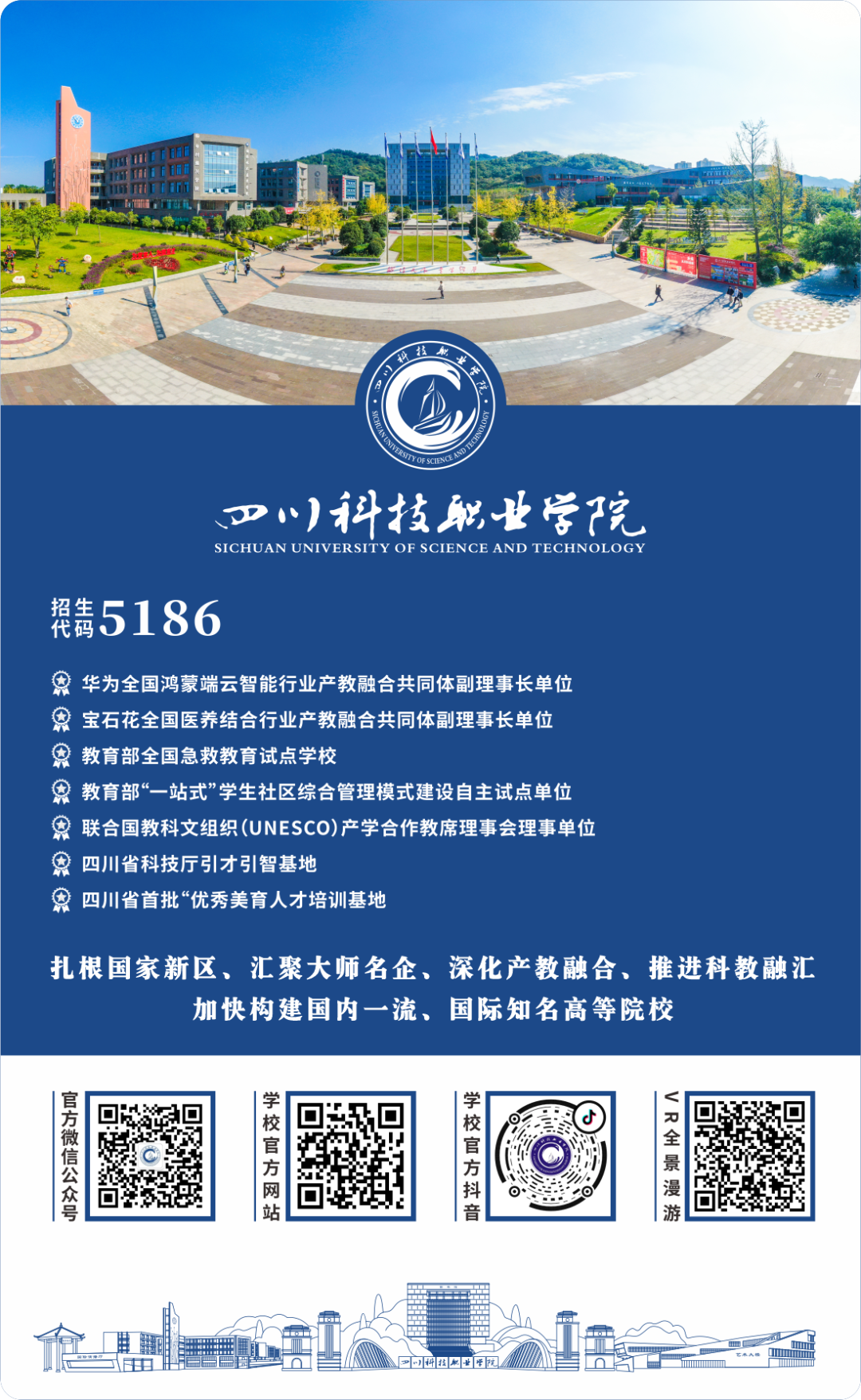 四川科技职业学院成立于2006年,经国家教育部备案,是一所全日制、创新型、特色鲜明的应用型高等院校。学校借鉴国内外知名职业大学的专业设置和办学模式,与众多头部知名企业合作,打造涵盖新工科、新商科、新医科、新文科、新艺术等多专业集群。