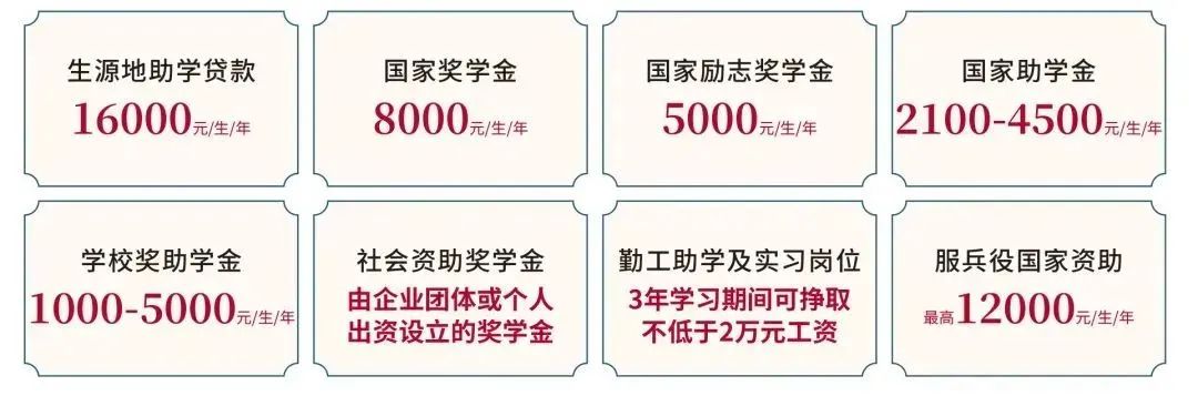 我校学生应征入伍,最高按照16000元/年进行学费补偿或国家助学贷款代偿。同时,从我校应征入伍的学生享受属地奖励,毕业生入伍时一次性享有30000元奖励金,在校生一次性享有10000元奖励金。对退出现役的义务兵发放自主就业一次性经济补助12000元。
