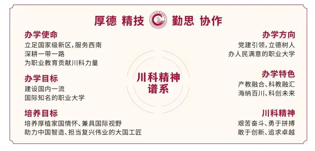学校扎根国家级新区——天府新区,主动融入国家科教兴国战略,紧抓成渝双城经济圈、天府新区发展带来的双重历史机遇,秉持“动脑动手知行合一”办学理念,践行“厚德、精技、勤思、协作”校训,赓续培养厚植家国情怀、兼具国际视野、助力中国智造、担当复兴伟业的大国工匠,以立德树人为根本,以人才培养为基础,以专业建设为龙头,以服务国家战略为导向,赋能产业转型升级和经济社会发展,加快构建国内一流、国际知名职业大学,谱写教育报国、科技强国、人才兴国的时代篇章,为以中国式现代化全面推进中华民族伟大复兴作出新的更大贡献。