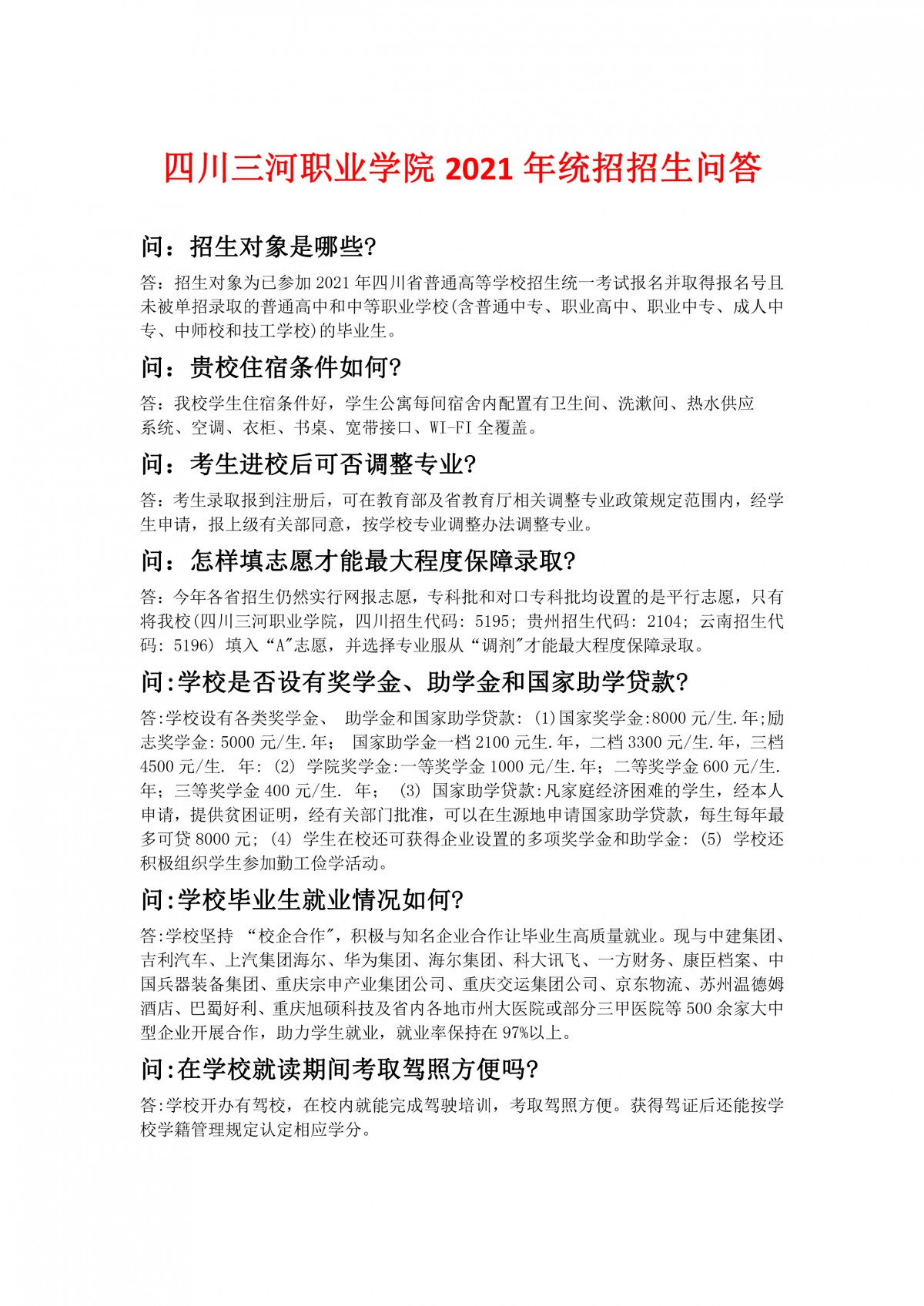 四川三河职业学院2021年统招招生问答
