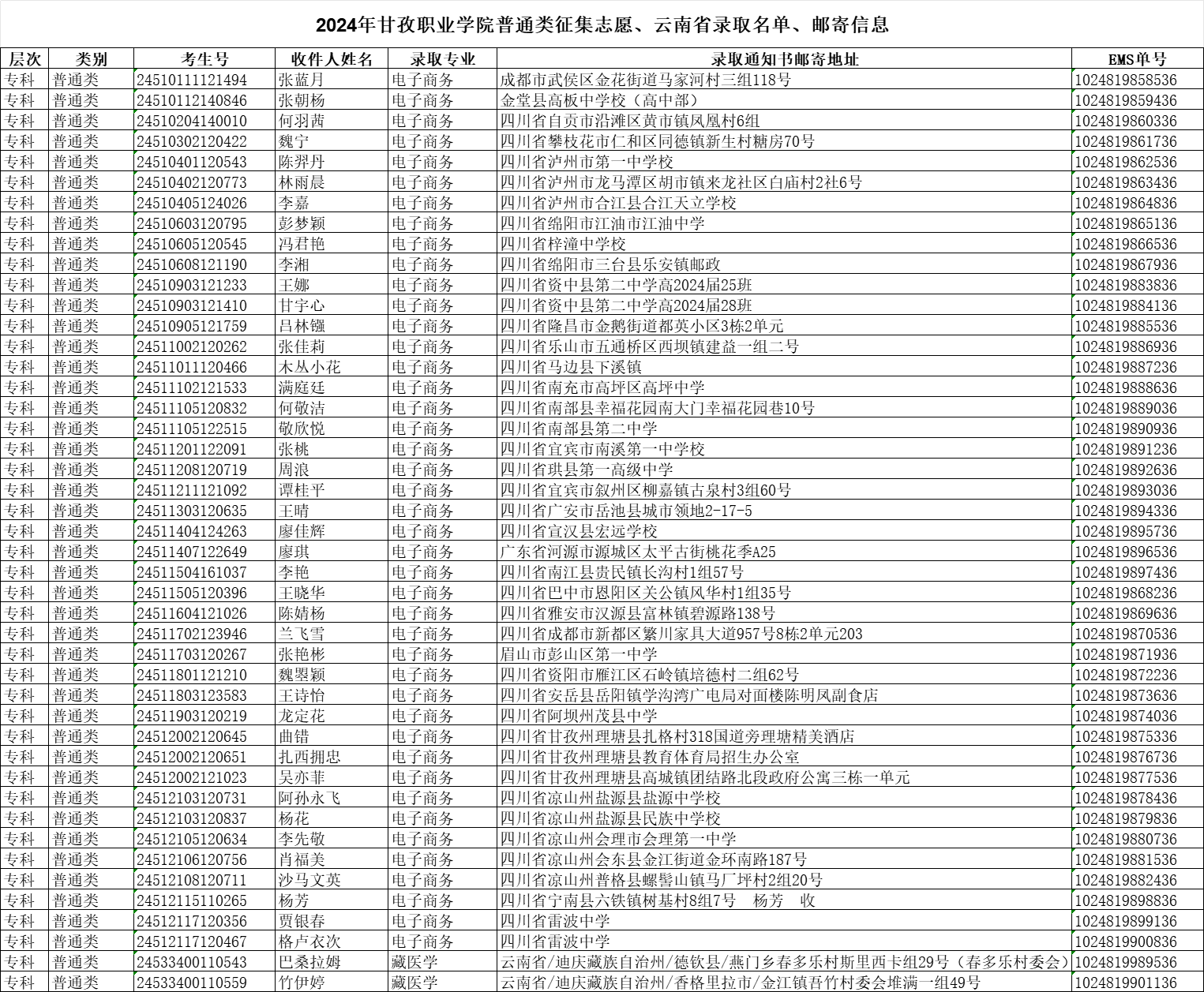 2024年甘孜职业学院普通类征集志愿、云南省录取名单、邮寄信息