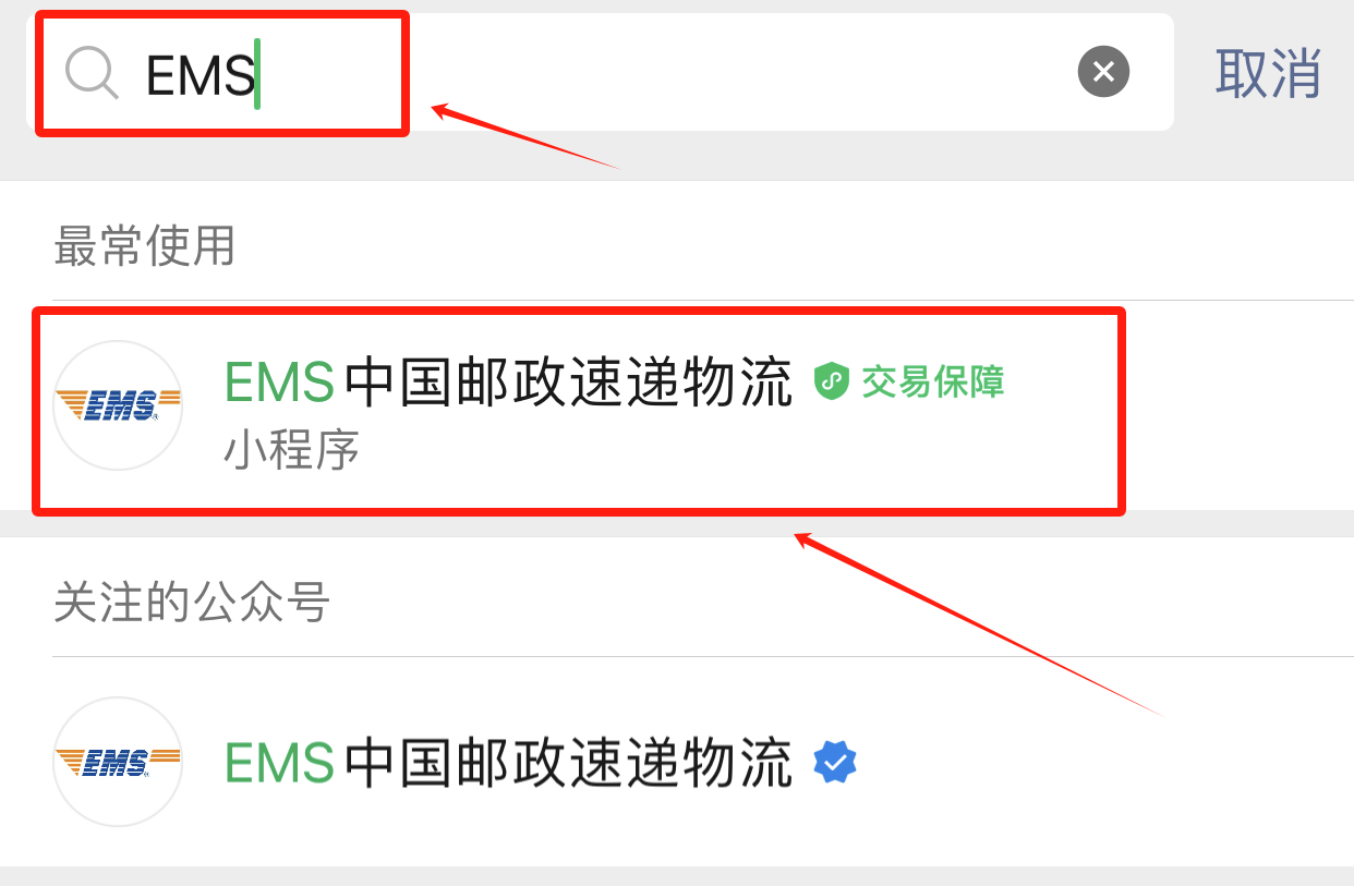 1.微信搜索“EMS”,点击进入“EMS中国邮政速递物流”小程序