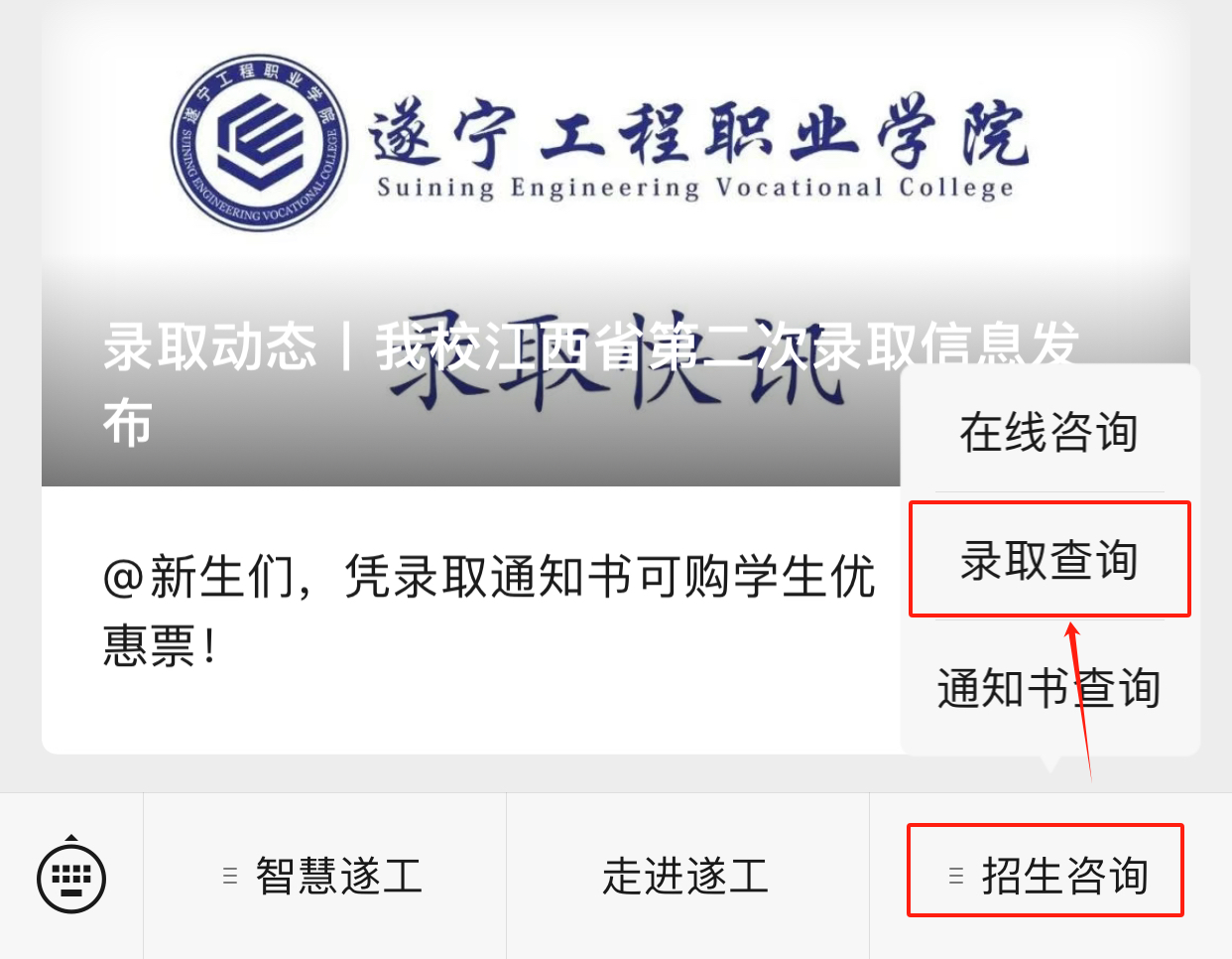 录取查询:1.关注遂宁工程职业学院公众号,点击右下角招生咨询,再点击录取查询